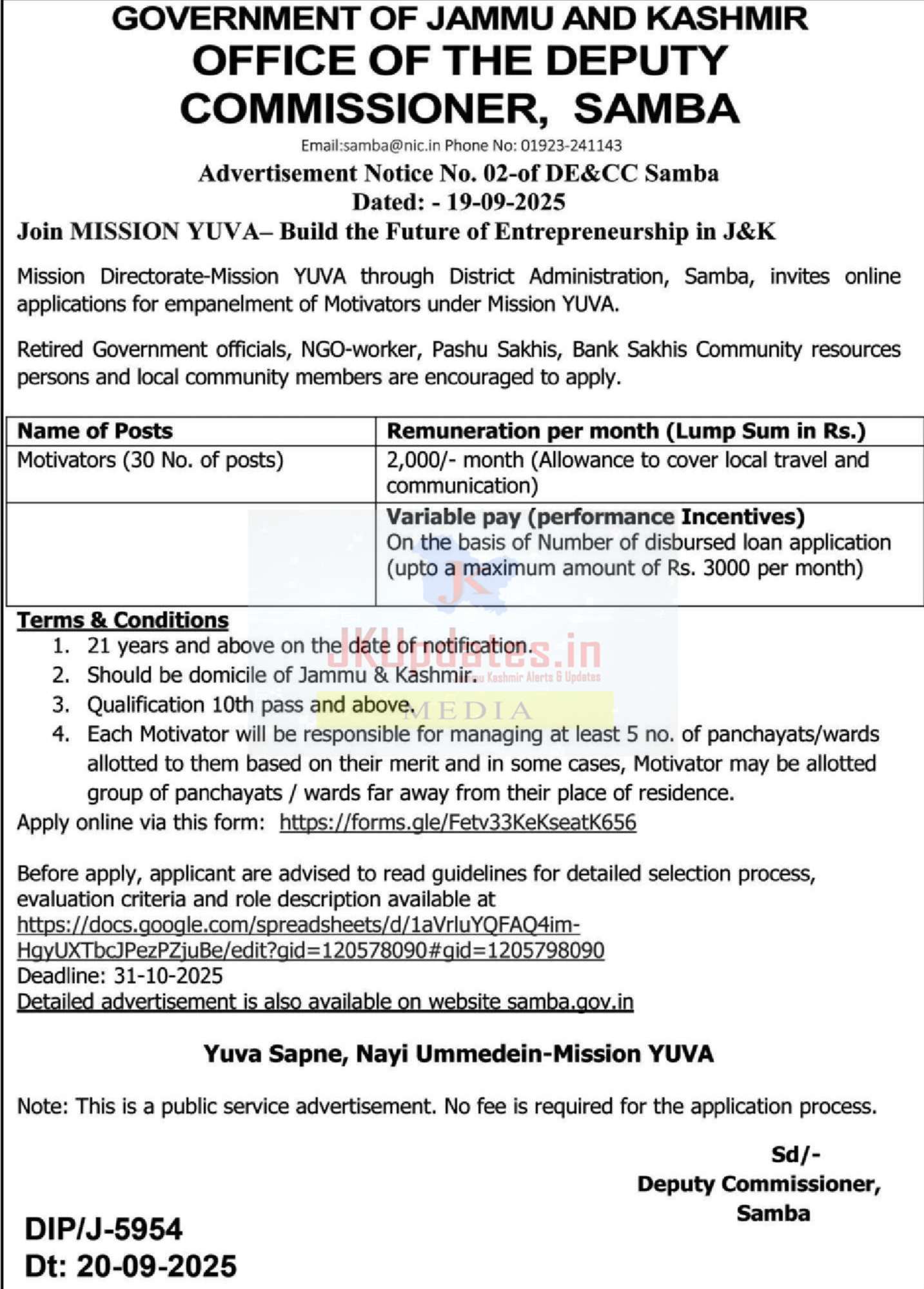 Mission Directorate-Mission YUVA through District Administration, Samba, invites online applications for empanelment of Motivators under Mission YUVA.