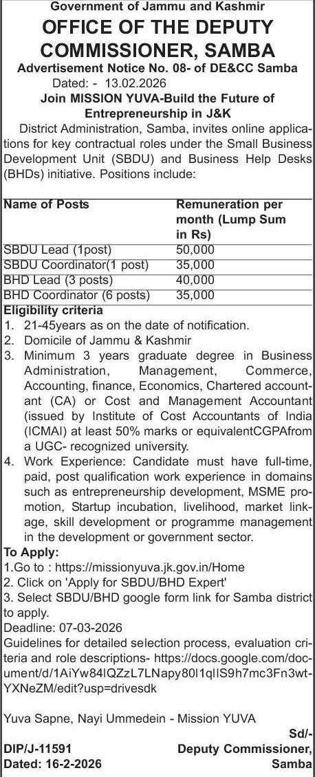 District Administration, Samba, invites online applications for key contractual roles under the Small Business Development Unit (SBDU) and Business Help Desks (BHDs) initiative. Positions include: