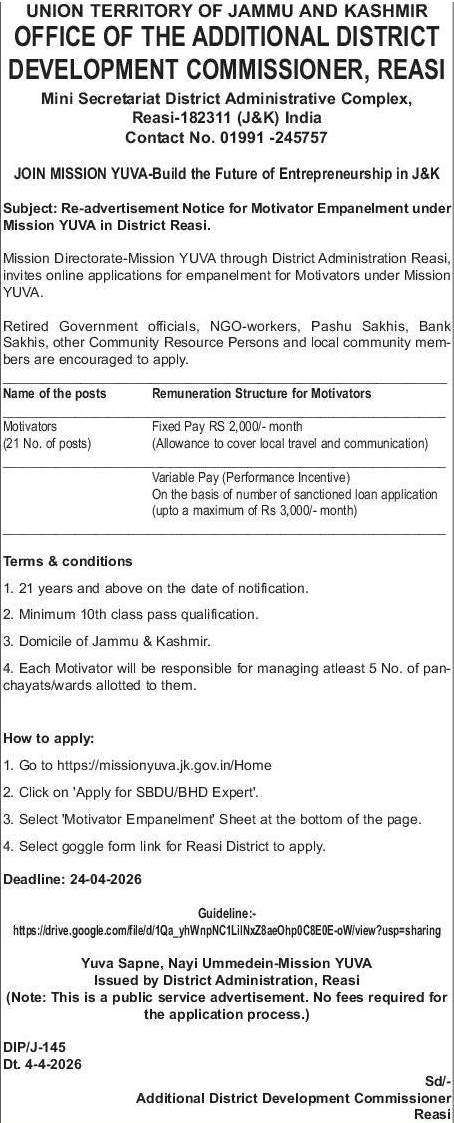 Mission YUVA: Re-advertisement Notice for Motivator Empanelment in Reasi District