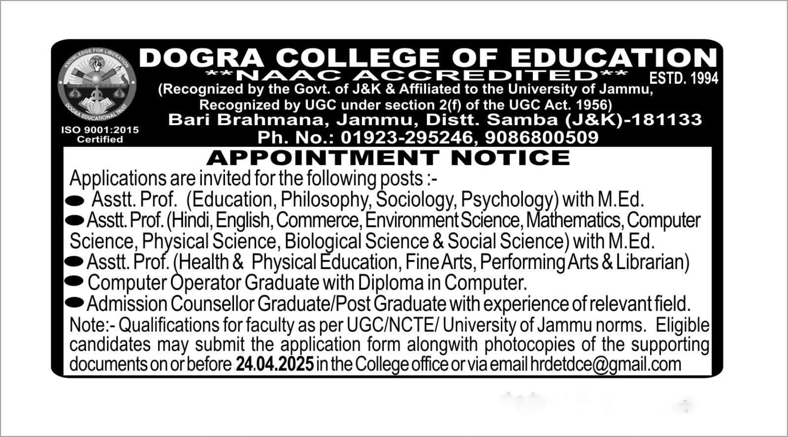 Note :- Qualifications for faculty as per UG/NCTE/ University of Jammu norms. Eligible candidates may submit the application form along with photocopies of the supporting documents on or before 24.04.2025 in the College office or via email [email protected]