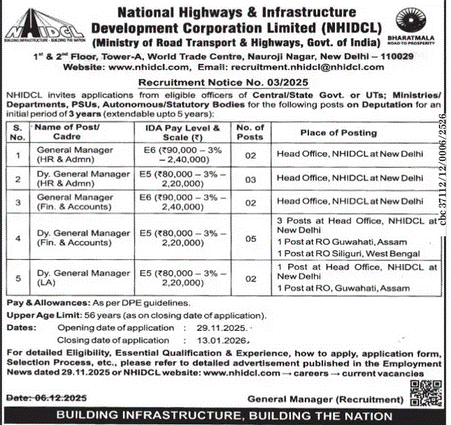 NHIDCL invites applications from eligible officers of Central/State Governments, UTs, Ministries/Departments, PSUs, Autonomous/Statutory Bodies for the following posts on deputation for an initial period of 5 years (extendable up to 10 years).