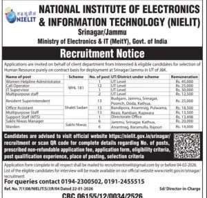 Candidates are advised to visit the official website https://nielit.gov.in/srinagar/recruitment or scan the QR code for complete details regarding number of posts, prescribed non-refundable application fee, application form, eligibility criteria, post qualification experience, place of posting, and selection criteria.