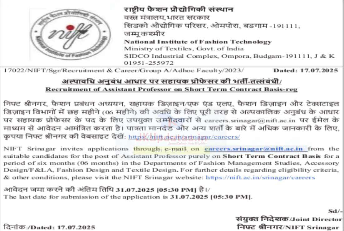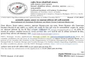 IFT Srinagar invites applications through e-mail on [email protected] from the suitable candidates for the post of Assistant Professor purely on Short Term Contract Basis for a period of six months (06 months) in the Departments of Fashion Management Studies, Accessory Design/F&LA, Fashion Design and Textile Design.