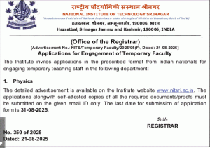 NIT Srinagar Jobs National Institute of Technology (NIT) Srinagar invites applications for Temporary Faculty in the Department of Physics.