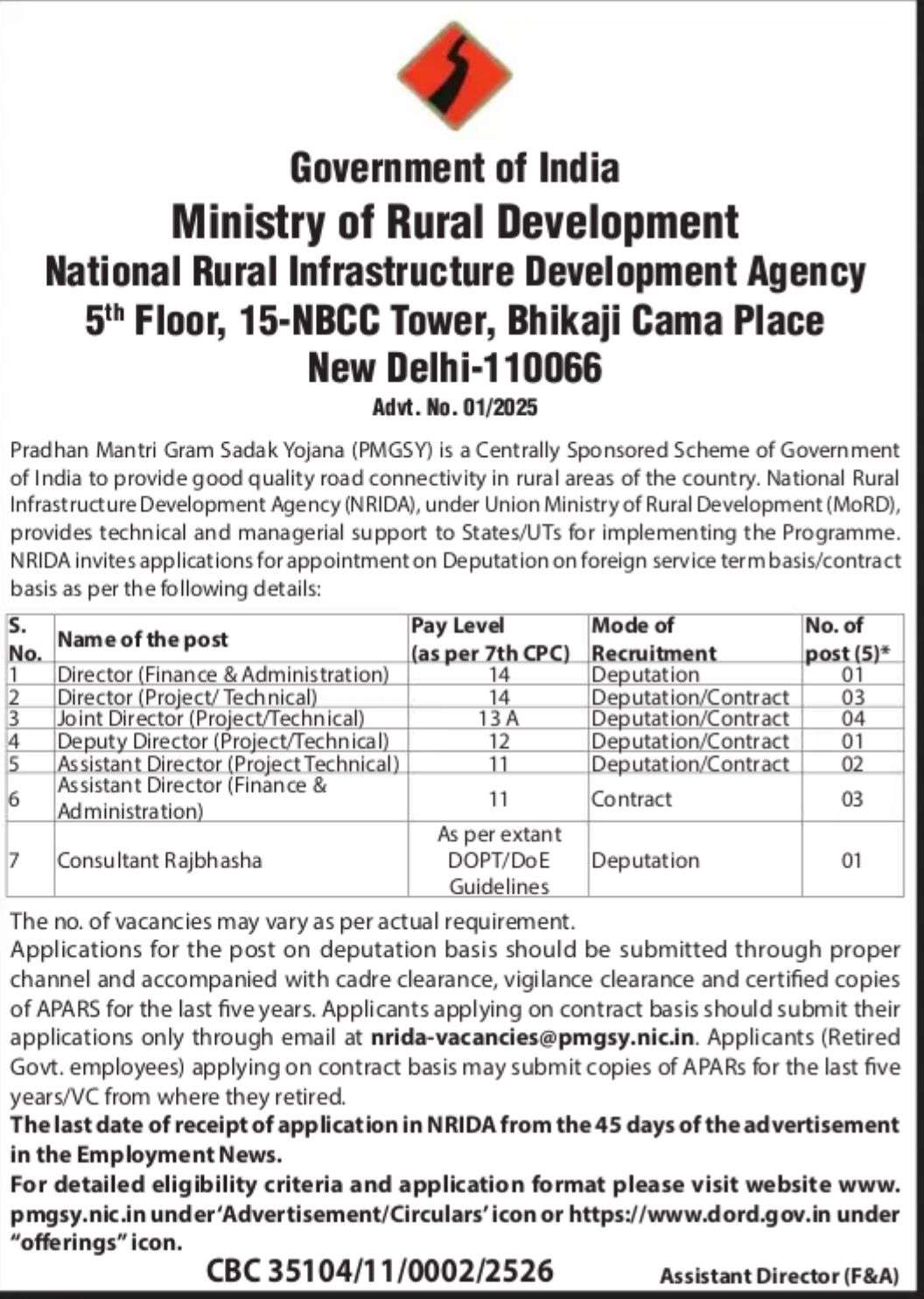 The National Rural Infrastructure Development Agency (NRIDA) invites applications for appointment on Deputation (foreign service term basis) / Contract basis under the Pradhan Mantri Gram Sadak Yojana (PMGSY), aimed at improving rural road connectivity.