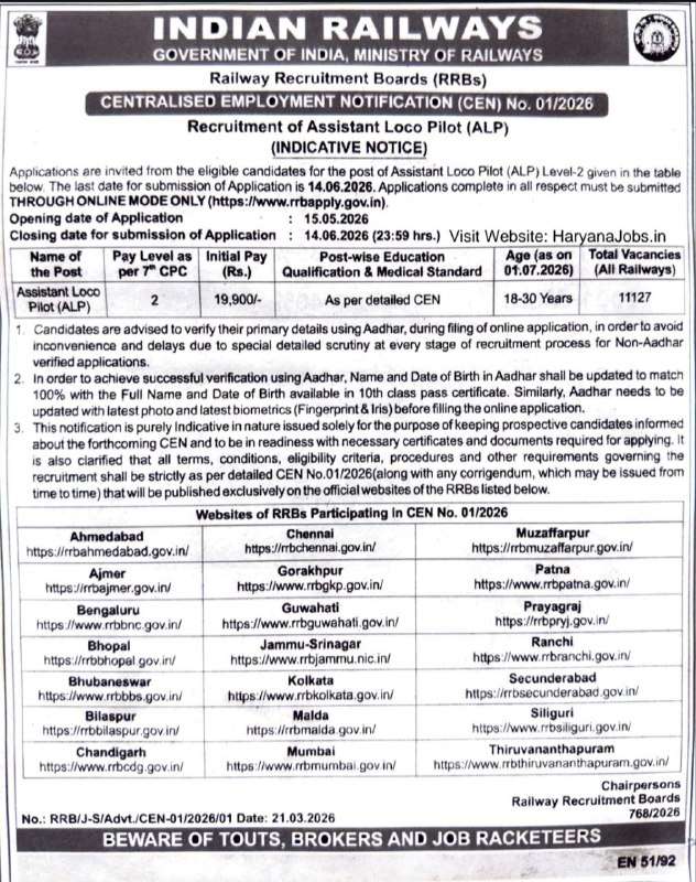 Interested candidates who wish to apply for the RRB post can submit their application online before 14 June 2026.