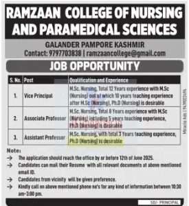 Kashmir Jobs Ramzaan College of Nursing and Parmedical Sciences Jobs Vice Principal, Associate Professor, Assistant Professor Jobs