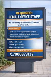 We are looking for a female staff member for regular office-related work. The candidate should be responsible, organized, and capable of handling basic accounting and computer tasks.