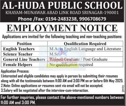 Interested and eligible candidates may apply in person by submitting their resumes along with all the testimonials between 11:00 AM and 3:00 PM on or before 8th May 2025.