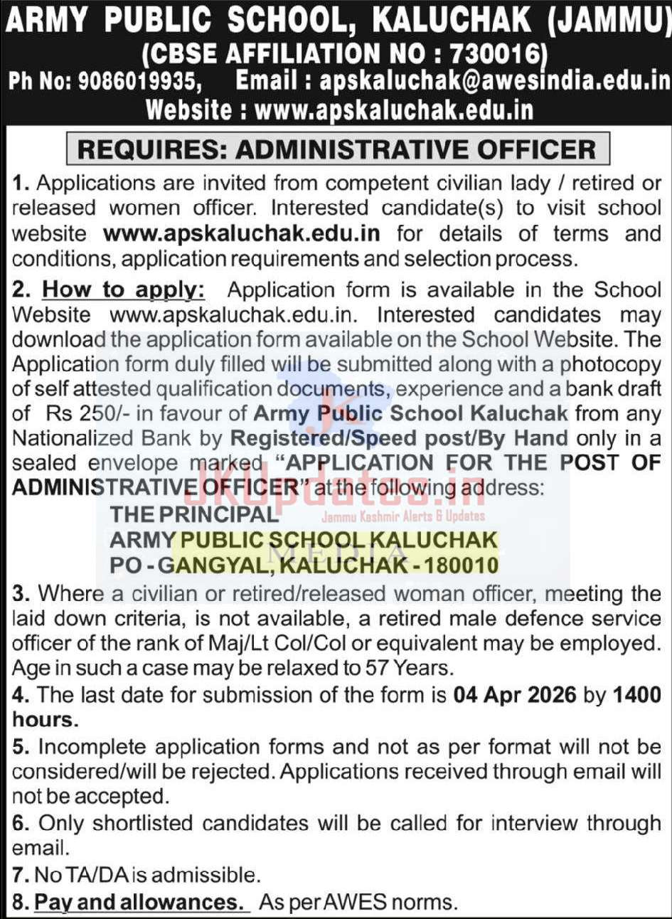 The application form, duly filled, should be submitted along with a photocopy of self-attested qualification documents, experience certificate, and a bank draft of Rs 250/- in favour of Army Public School Kaluchak, drawn from any Nationalized Bank, by Registered Post / Speed Post / By Hand only, in a sealed envelope clearly marked “APPLICATION FOR THE POST OF ADMINISTRATIVE OFFICER” at the following address: