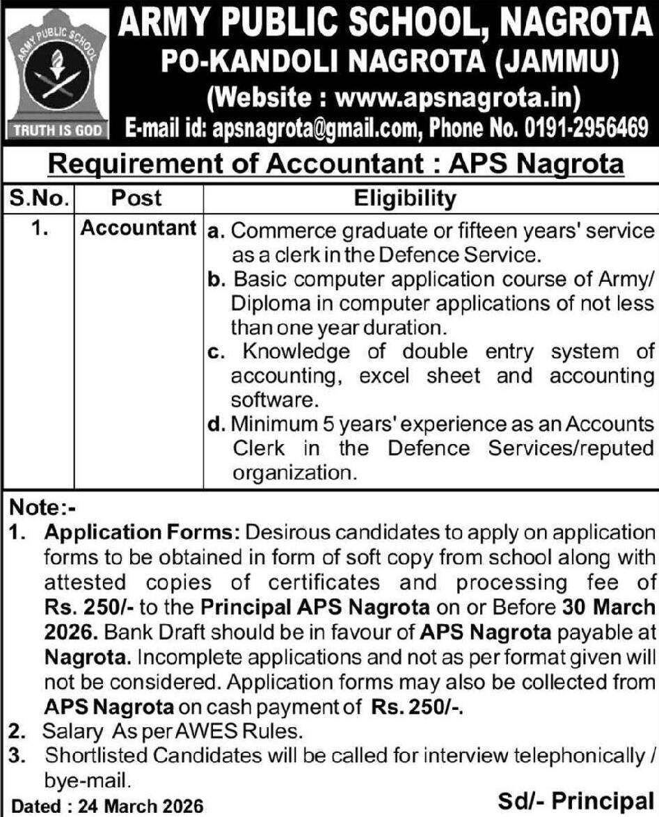 Desirous candidates are required to apply on application forms to be obtained in the form of a soft copy from the school, along with attested copies of certificates and a processing fee of Rs. 250/-, to be submitted to the Principal, APS Nagrota, on or before 30 March 2026.