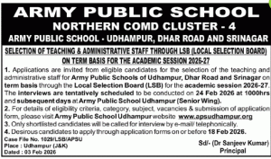 Applications are invited from eligible candidates for the selection of Teaching and Administrative Staff for Army Public Schools of Udhampur, Dhar Road and Srinagar on term basis through the Local Selection Board (LSB) for the academic session 2026–27.