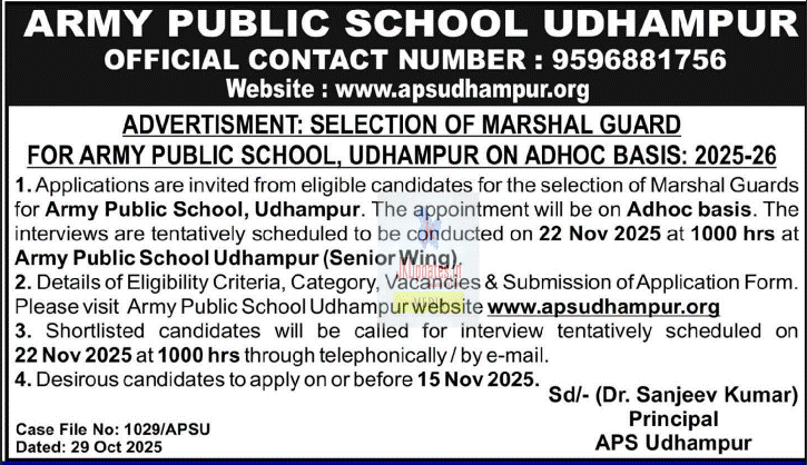 Applications are invited from eligible candidates for the selection of Marshal Guards for Army Public School, Udhampur. The appointment will be on Adhoc basis.