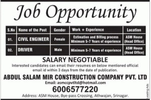 Recruitment in ASM Construction Company Pvt. Ltd Srinagar