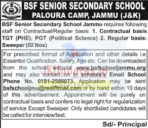 For prescribed format of Application and other details i.e Essential Qualification, Salary, Age etc. Can be downloaded from the school website www.bsfschooljammu.org and may also contact on to schools’s Email School Phone No. 0191-2586073.