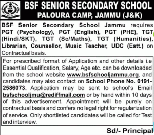 For prescribed format of Application and other details i.e. Essential Qualification, Salary, Age etc. can be downloaded from the school website www.bsfschooljammu.org and candidates may also contact on School Phone No. 0191-2586073.