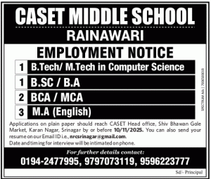 Applications on plain paper should reach CASET Head office, Shiv Bhawan Gole Market, Karan Nagar, Srinagar by or before 10/11/2025. You can also send your resume on our Email ID, i.e., [email protected].