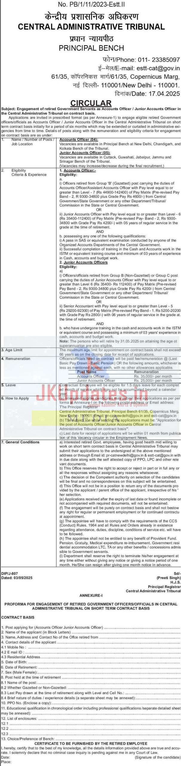 Applications are invited in prescribed format (as per Annexure-1) to engage eligible retired Government officers/officials as Accounts Officer / Junior Accounts Officer in the Central Administrative Tribunal on short term contract basis initially for a period of six months which may be extended or curtailed in administrative exigencies from time to time.