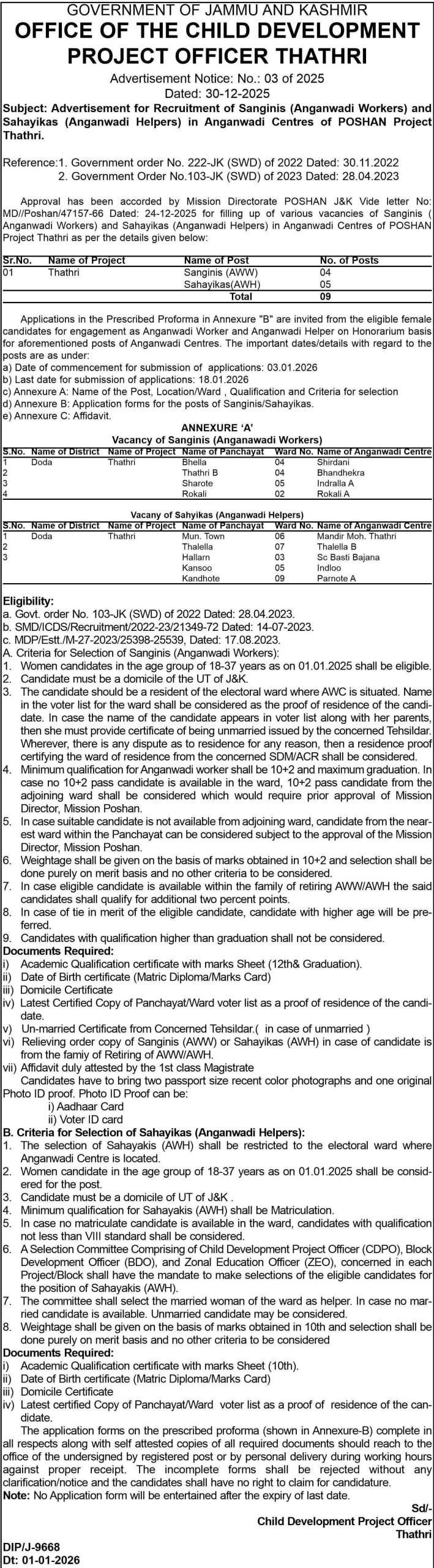 Approval has been accorded by Mission Directorate POSHAN, J&K vide letter No. MD/Poshan/47157-66 dated 24-12-2025 for filling up of various vacancies of Sanganis (Anganwadi Workers) and Sahayikas (Anganwadi Helpers) in Anganwadi Centres of POSHAN Project Thathri as per details given below.