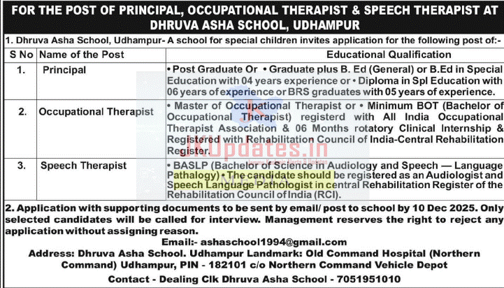 For the post of Principal, Occupational Therapist & Speech Therapist at Dhruva Asha School, Udhampur
