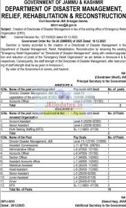 Director, Disaster Management, J&K (by upgradation of the existing post of CEO, ERO, J&K), Pay Level-13 (₹123100–215900), one post.