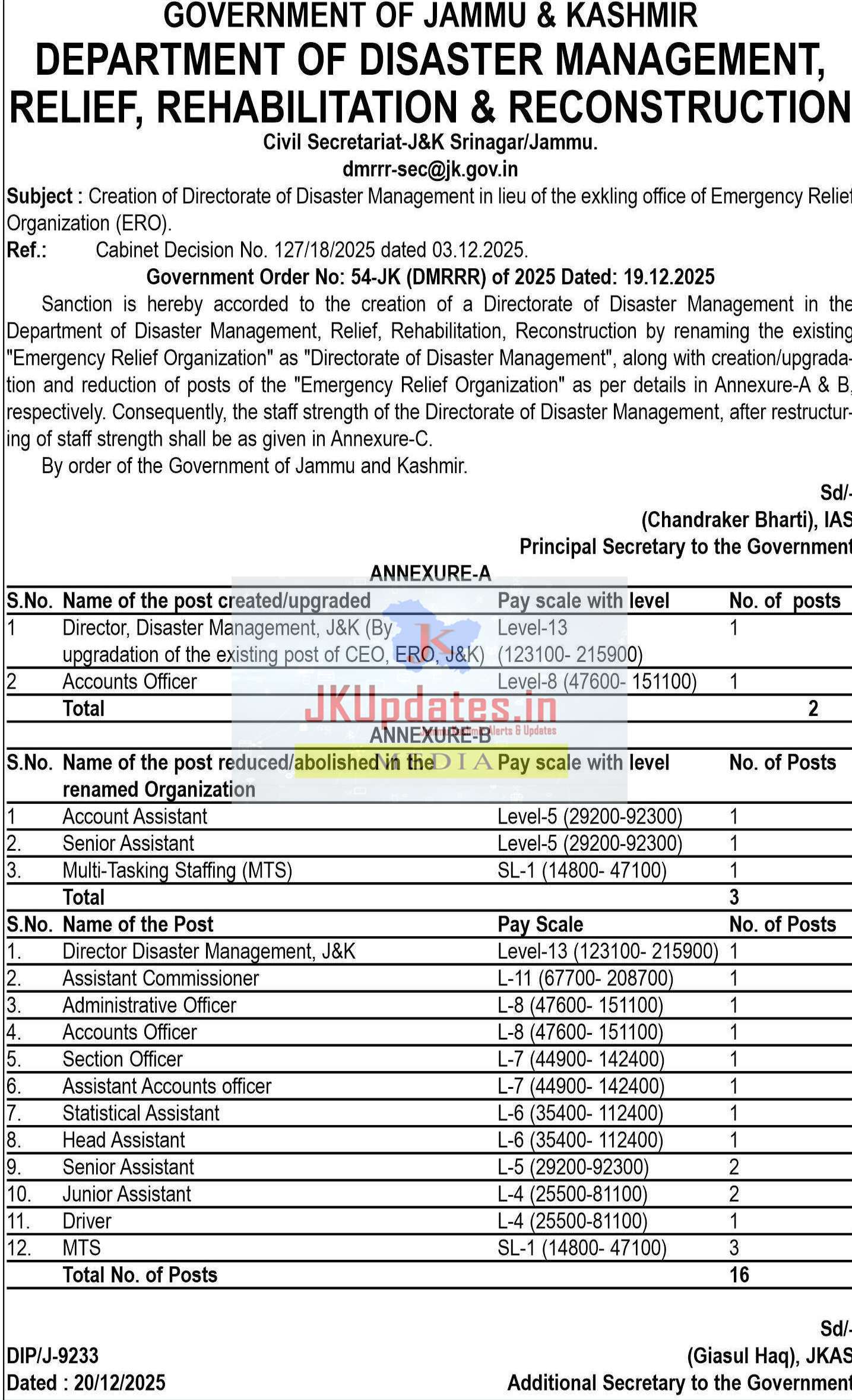 Sanction is hereby accorded to the creation of a Directorate of Disaster Management in the Department of Disaster Management, Relief, Rehabilitation and Reconstruction by renaming the existing “Emergency Relief Organization” as “Directorate of Disaster Management”, along with creation, upgradation and reduction of posts of the Emergency Relief Organization as per details given in Annexure-A and Annexure-B respectively. Consequently, the staff strength of the Directorate of Disaster Management, after restructuring, shall be as given in Annexure-C.