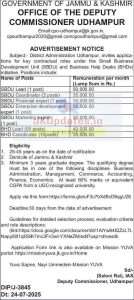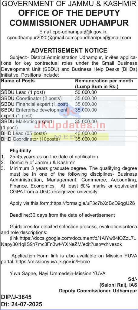 District Administration Udhampur, invites applications for key contractual roles under the Small Business Development Unit (SBDU) and Business Help Desks (BHDs) initiative. Positions include: