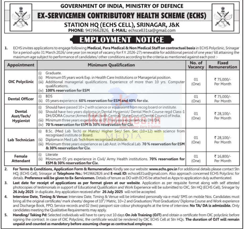 ECHS invites applications to engage the following Medical, Para Medical & Non Medical Staff on contractual basis in ECHS Polyclinic, Srinagar for a period up to 31 March 2026/one year (on receipt of vacancy for F.Y. 2026–27) renewable for additional period of one year (till attaining the maximum age subject to performance of candidates/other conditions according to the criteria as mentioned against each post):
