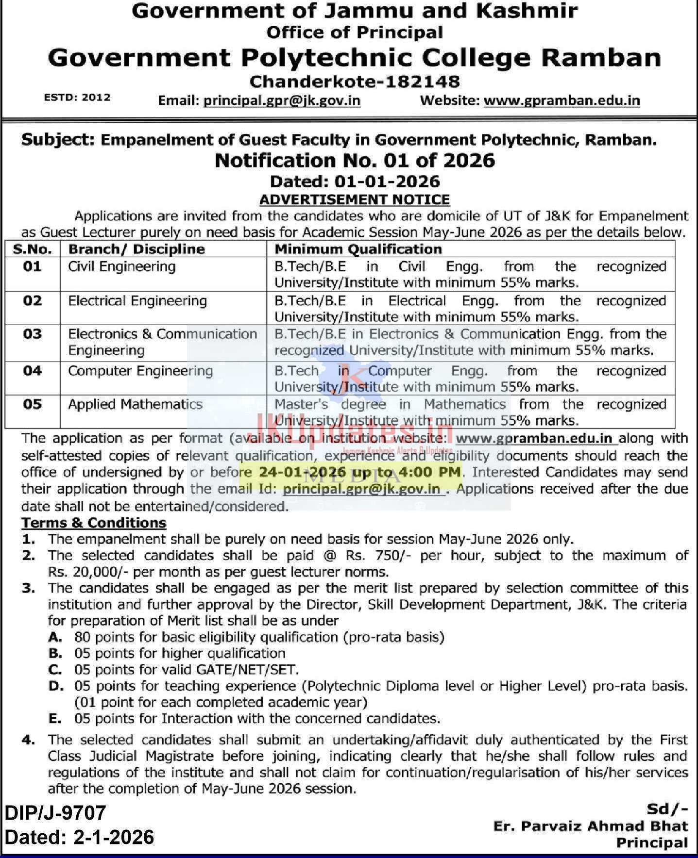 The application as per format (available on institution website : www.gpramban.edu.in) along with self-attested copies of relevant qualification, experience and eligibility documents should reach the office of undersigned by or before 24-01-2026 up to 4:00 PM. Interested candidates may send their application through the email ID [email protected].
