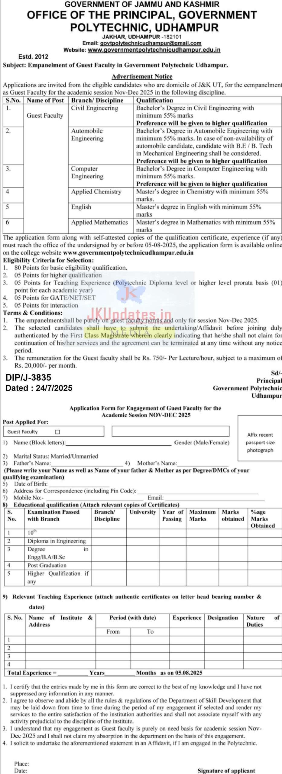 Empanelment of Guest Faculty in Government Polytechnic Udhampur