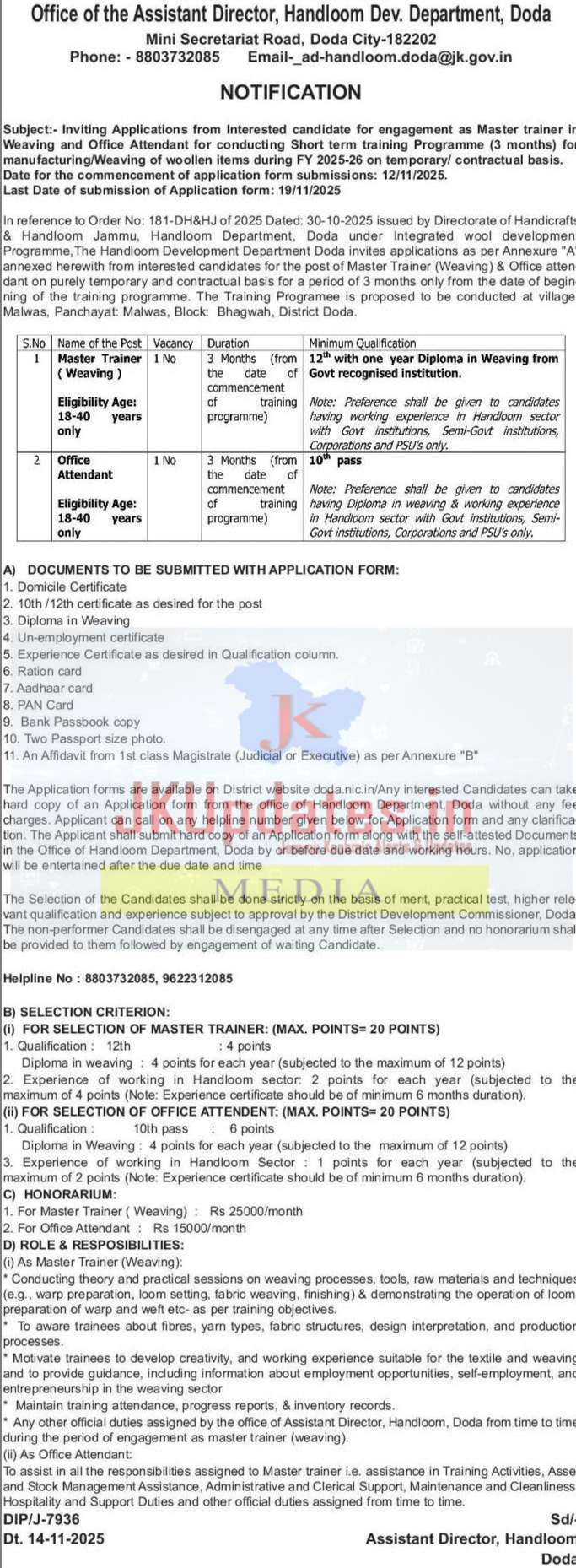 In reference to Order No: 181-DH&HJ of 2025 Dated: 30-10-2025 issued by Directorate of Handicrafts & Handloom Jammu, Handloom Department, Doda under Integrated wool development Programme, The Handloom Development Department Doda invites applications as per Annexure “A” annexed herewith from interested candidates for the post of Master Trainer (Weaving) & Office attendant on purely temporary and contractual basis for a period of 3 months only from the date of beginning of the training programme. The Training Programme is proposed to be conducted at village: Malwas, Panchayat: Malwas, Block: Bhagwah, District Doda.
