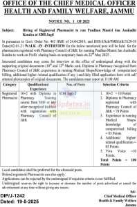 Qualifications/ Experience : 10+2 with Diploma in Pharmacist Pharmacy Training course from SMF or any other recognized Institute with registration with Pharmacy Council of J&K
