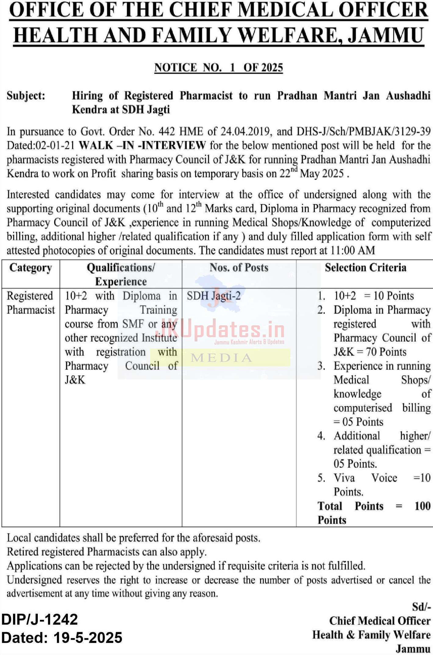 In pursuance to Govt. Order No. 442 HME of 24.04.2019, and DHS-J/Sch/PMBJAK/3129-39 Dated:02-01-2I WAI.K -IN โ€ขINTERVIEW for the below mentioned post will be held for the pharmacists registered with Pharmacy Council of J&K for running. Pradhan Mantri Ian Aushadhi Kendra to work on Profit sharing basis on temporary basis on 22 May 2025 .