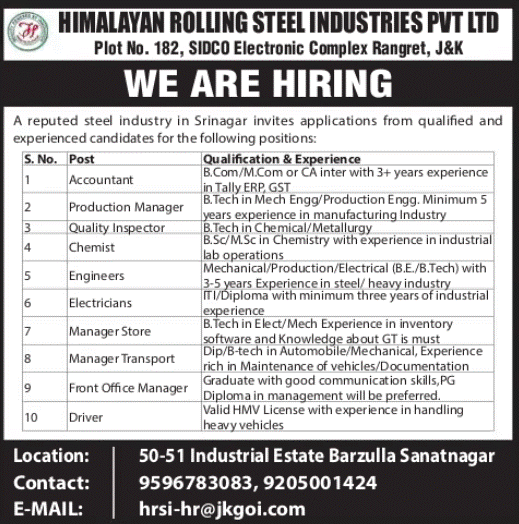 A reputed steel industry in Srinagar invites applications from qualified and experienced candidates for the following positions: