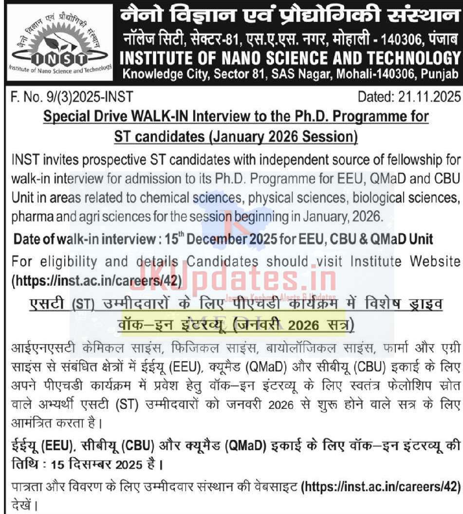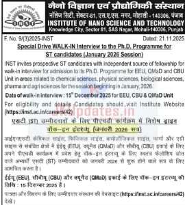 INST invites prospective ST candidates with an independent source of fellowship for walk-in interview for admission to its Ph.D. Programme for EEU, QMaD and CBU Unit in areas related to chemical sciences, physical sciences, biological sciences, pharma and agri sciences for the session beginning in January 2026.