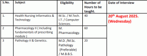 Applications on prescribed format (attached herewith), are invited from Interested eligible candidates to appear for walk-in-interview for the engagement of guest faculty in Alamdar Memorial College of Nursing & Medical Technology, Charar-i-Sharief, during the current session as per the following details