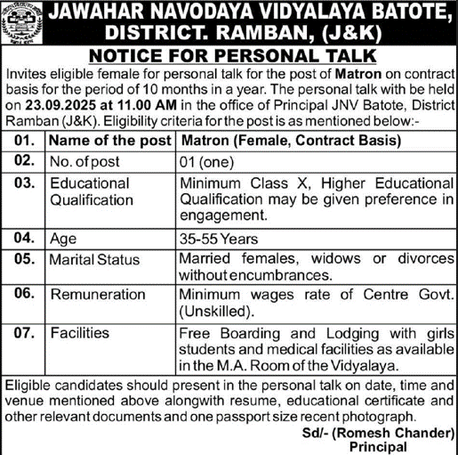 Invites eligible female for personal talk for the post of Matron on contract basis for the period of 10 months in a year. The personal talk will be held on 23.09.2025 at 11.00 AM in the office of Principal JNV Batote, District Ramban (J&K). Eligibility criteria for the post is as mentioned below: