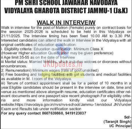 Walk in interview for the post of Matron (Female) purely on contract basis for the session 2025-2026 is scheduled to be held in this Vidyalaya on 21/11/2025.