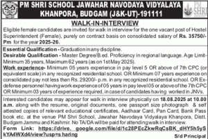 Eligible female candidates should appear in person for the walk-in interview on 18 August 2025 at 10:00 AM at Jawahar Navodaya Vidyalaya Khanpora, Budgam, J&K.