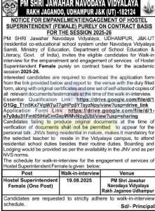 | Hostel Superintendent Female (One Post) | 19.08.2025 | PM Shri Jawahar Navodaya Vidyalaya Rakh Jaganoo Udhampur |