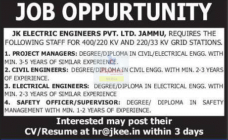 JK Electric Engineers Pvt. Ltd. Jammu, requires the following staff for 400/220 KV and 220/33 KV Grid Stations.