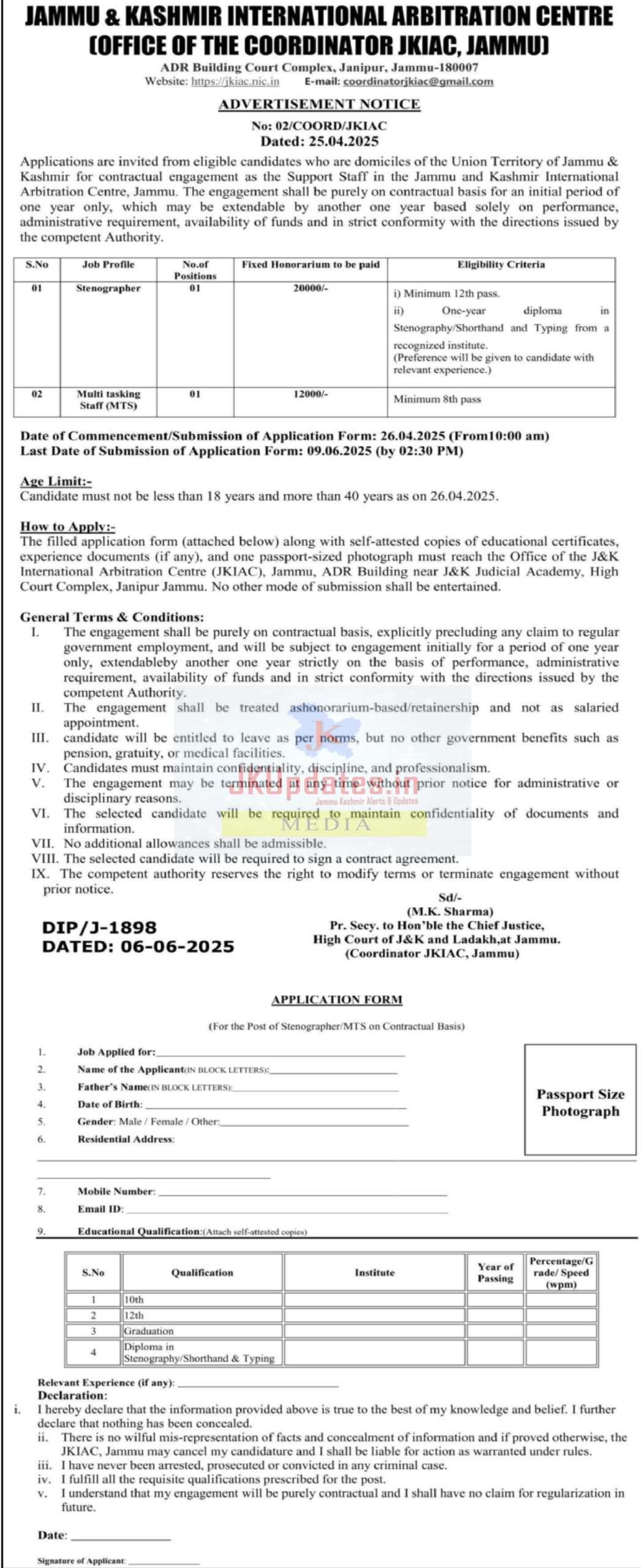 How to Apply :- The filled application form (attached below) along with self-attested copies of educational certificates, experience documents (if any), and one passport-sized photograph must reach the Office of the J&K International Arbitration Centre (JKIAC), Jammu, ADR Building near J&K Judicial Academy, High Court Complex, Janipur Jammu. No other mode of submission shall be entertained.