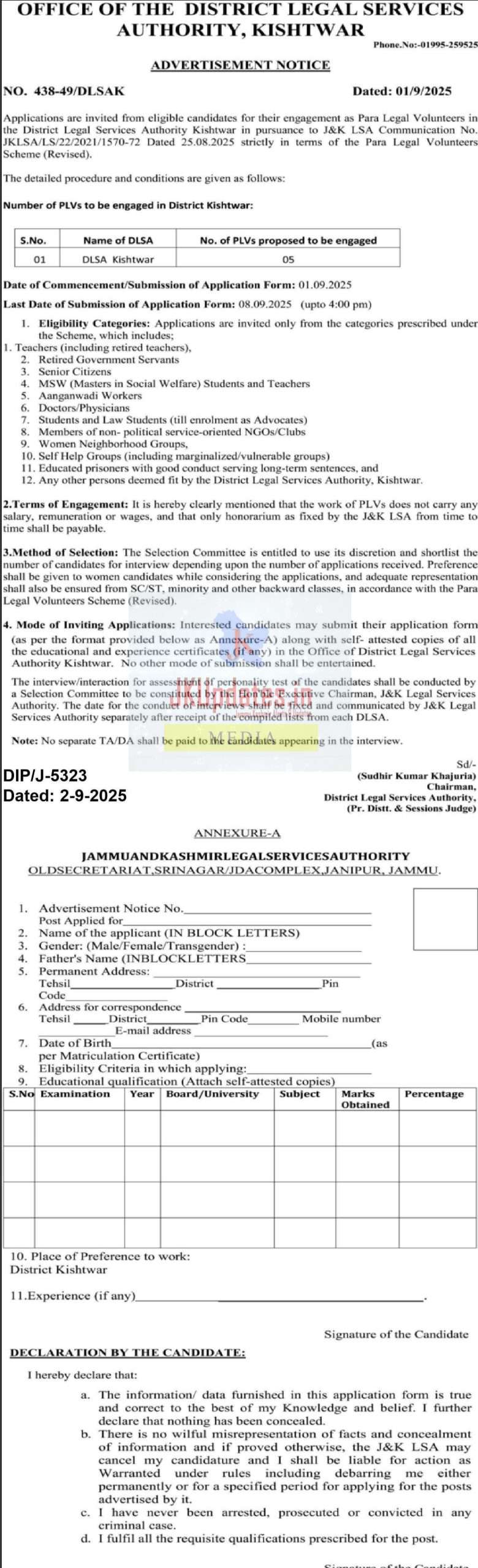 Applications are invited from eligible candidates for their engagement as Para Legal Volunteers in the District Legal Services Authority Kishtwar in pursuance to J&K LSA Communication No. JKLSA/LS/22/2021/1570-72 Dated 25.08.2025 strictly in terms of the Para Legal Volunteers Scheme (Revised).