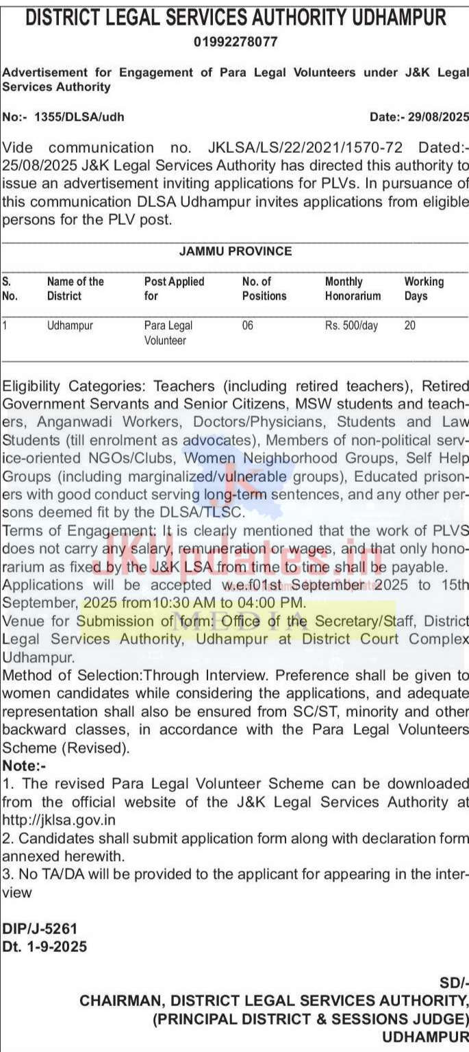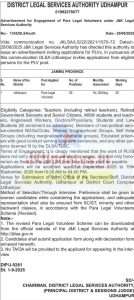 Vide communication no. JKLSA/LS/22/2021/1570-72 Dated:- 25/08/2025 J&K Legal Services Authority has directed this authority to issue an advertisement inviting applications for PLVs. In pursuance of this communication DLSA Udhampur invites applications from eligible persons for the PLV post.