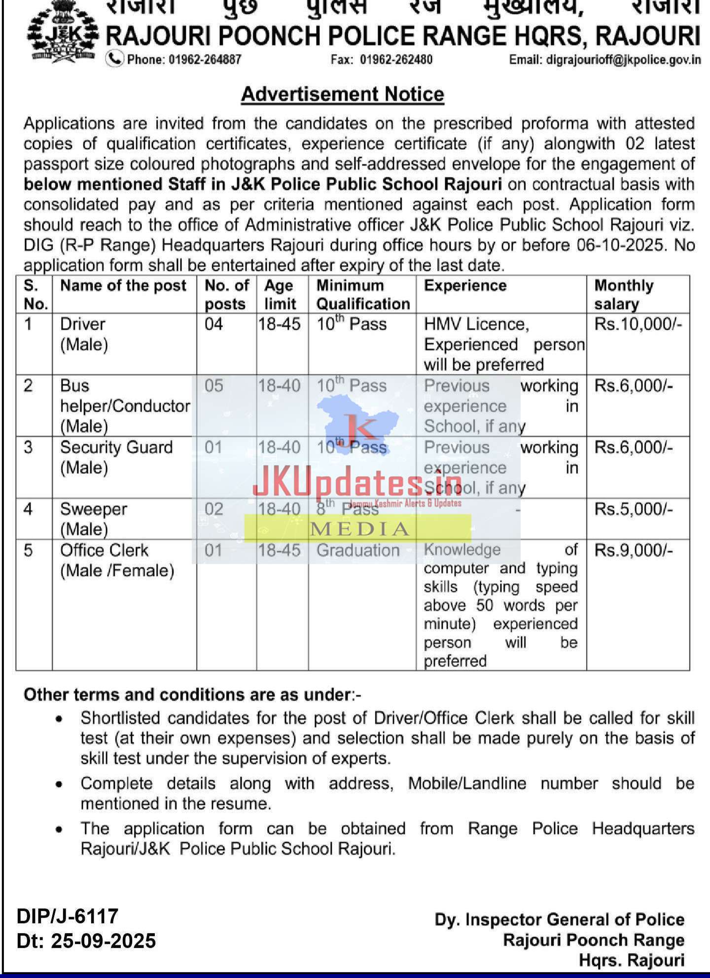 Applications are invited from the candidates on the prescribed proforma with attested copies of qualification certificates, experience certificate (if any) along with 02 latest passport size coloured photographs and self-addressed envelope for the engagement of below mentioned Staff in J&K Police Public School Rajouri on contractual basis with consolidated pay and as per criteria mentioned against each post. Application form should reach to the office of Administrative officer J&K Police Public School Rajouri viz. DIG (R-P Range) Headquarters Rajouri during office hours by or before 06-10-2025. No application form shall be entertained after expiry of the last date.