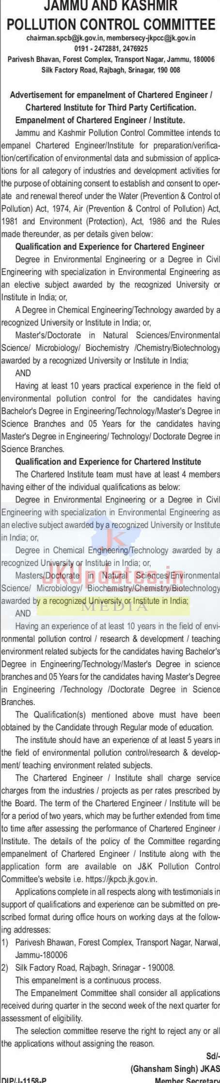 Jammu and Kashmir Pollution Control Committee intends to empanel Chartered Engineer/Institute for preparation/verification/certification of environmental data and submission of applications for all category of industries and development activities for the purpose of obtaining consent to establish and consent to operate and renewal thereof under the Water (Prevention & Control of Pollution) Act, 1974, Air (Prevention & Control of Pollution) Act, 1981 and Environment (Protection), Act, 1986 and the Rules made thereunder, as per details given below: