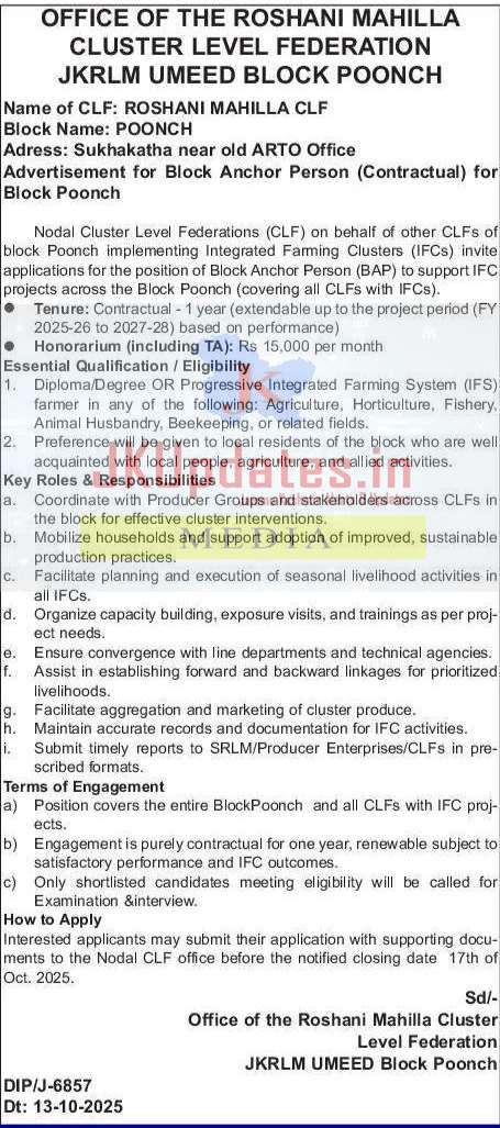 Nodal Cluster Level Federations (CLF) on behalf of other CLFs of block Poonch implementing Integrated Farming Clusters (IFCs) invite applications for the position of Block Anchor Person (BAP) to support IFC projects across the Block Poonch (covering all CLFs with IFCs).