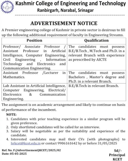 A Premier engineering college of Kashmir in private sector is desirous to fill up the following additional requirement of faculty in Engineering Streams.