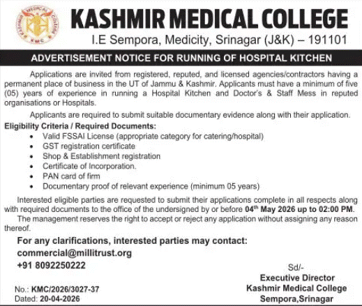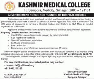 Applications are invited from registered, reputed, and licensed agencies/contractors having a permanent place of business in the UT of Jammu & Kashmir.