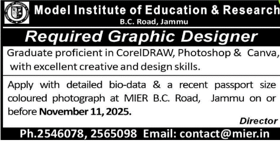 Apply with detailed bio-data & a recent passport size coloured photograph at MIER B.C. Road, Jammu on or before November 11, 2025.